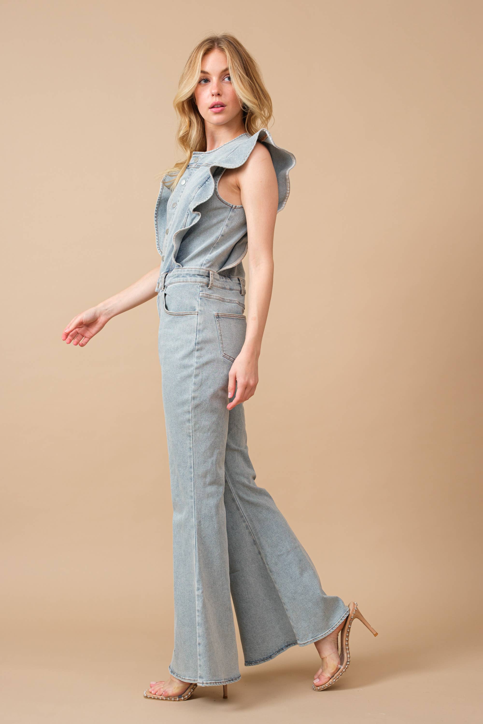 Ruffle Bell Bottom Stretch Denim Jumpsuit