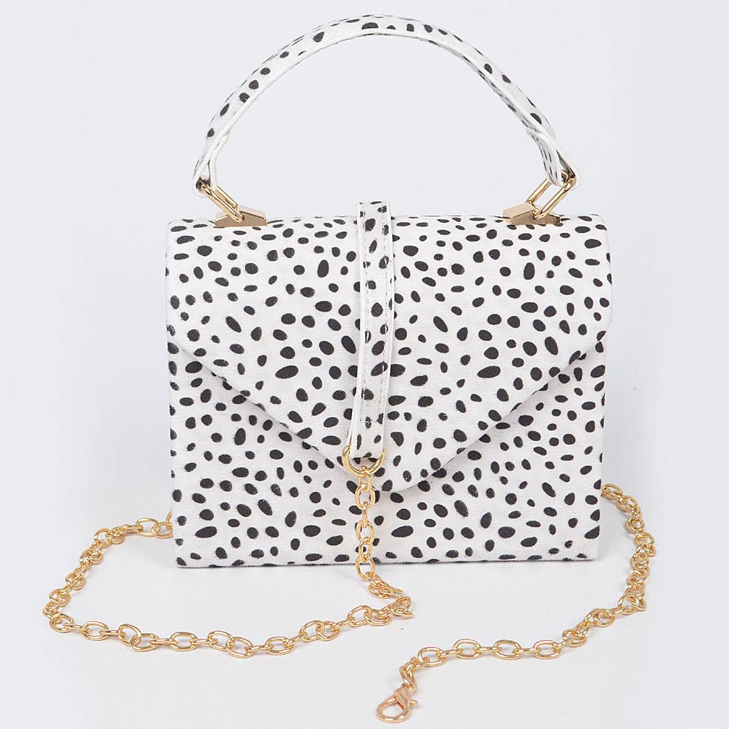 * Faux Cheetah Fur Top Handle Crossbody Bag * 6.5W*4.75H*3D * Polyurethane, Mixed Metal.