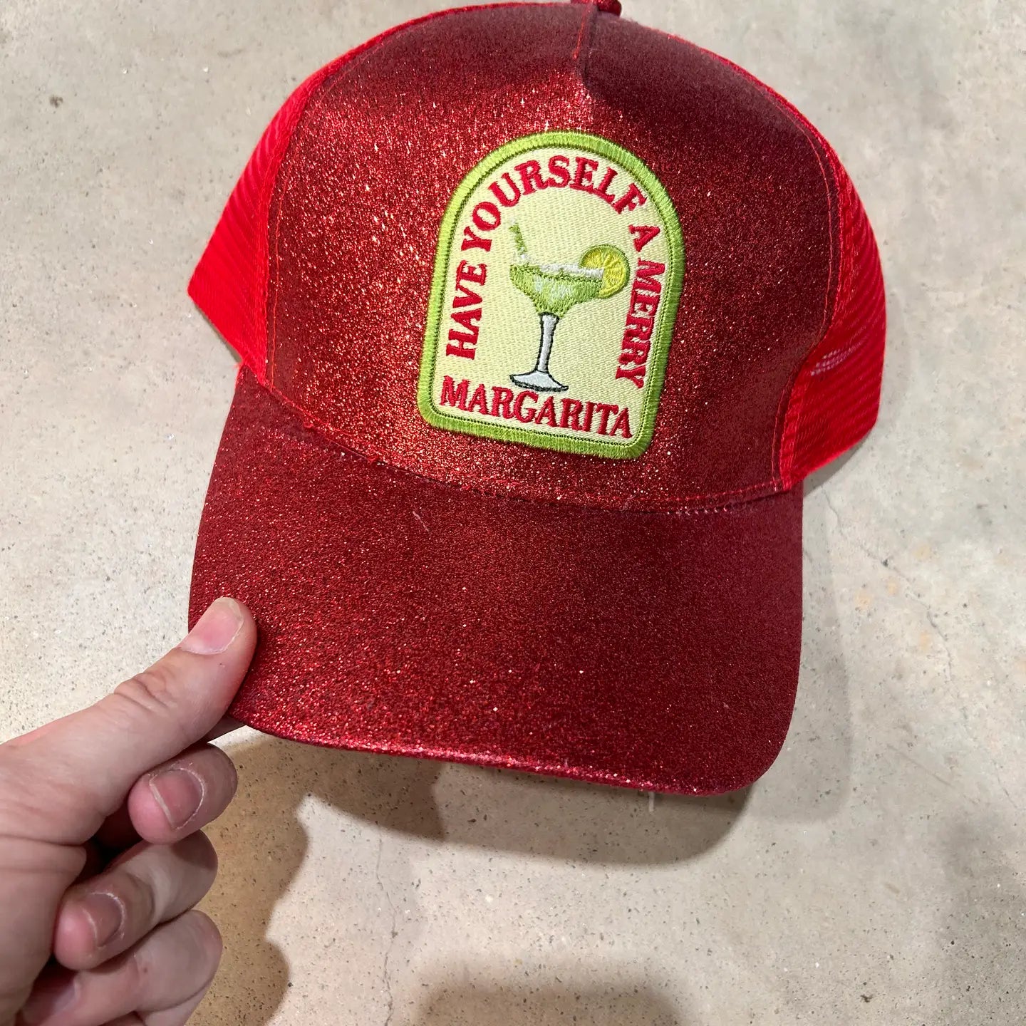 Why don't you go ahead & have yourself a Merry Margarita!! The perfect trucker hat for sippin' & wrapping this holiday season. This is an embroidered patch with merrowed edge. Available on a glitter cap or a foam trucker hat. Glitter caps are structured with a mesh back, ponytail opening, and adjustable velcro enclosure. Foam truckers have a foam front, mesh back, and adjustable snapback enclosure.