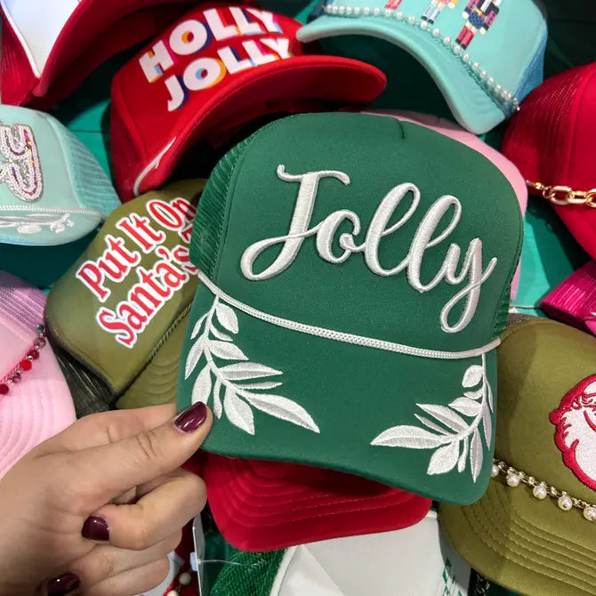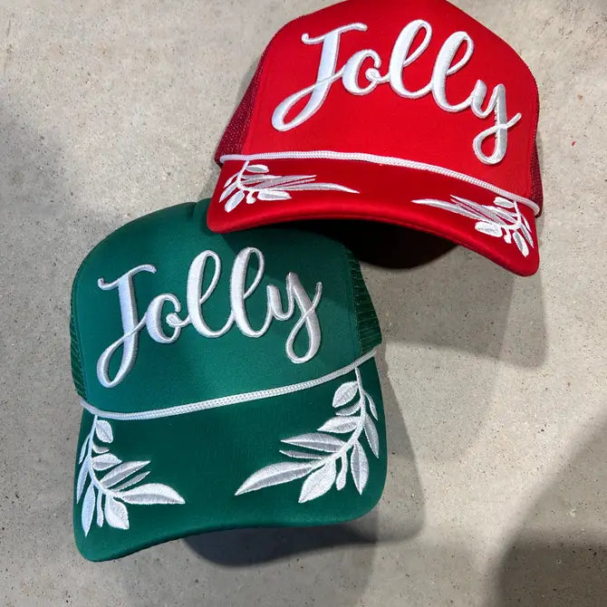 The jolliest trucker hat there ever was!! White thread, puff embroidery on our Vibes captain hats! We are obsessed with these new caps. Vibes Hat Co captain hats are a foam front, mesh back, and adjustable snapback enclosure.