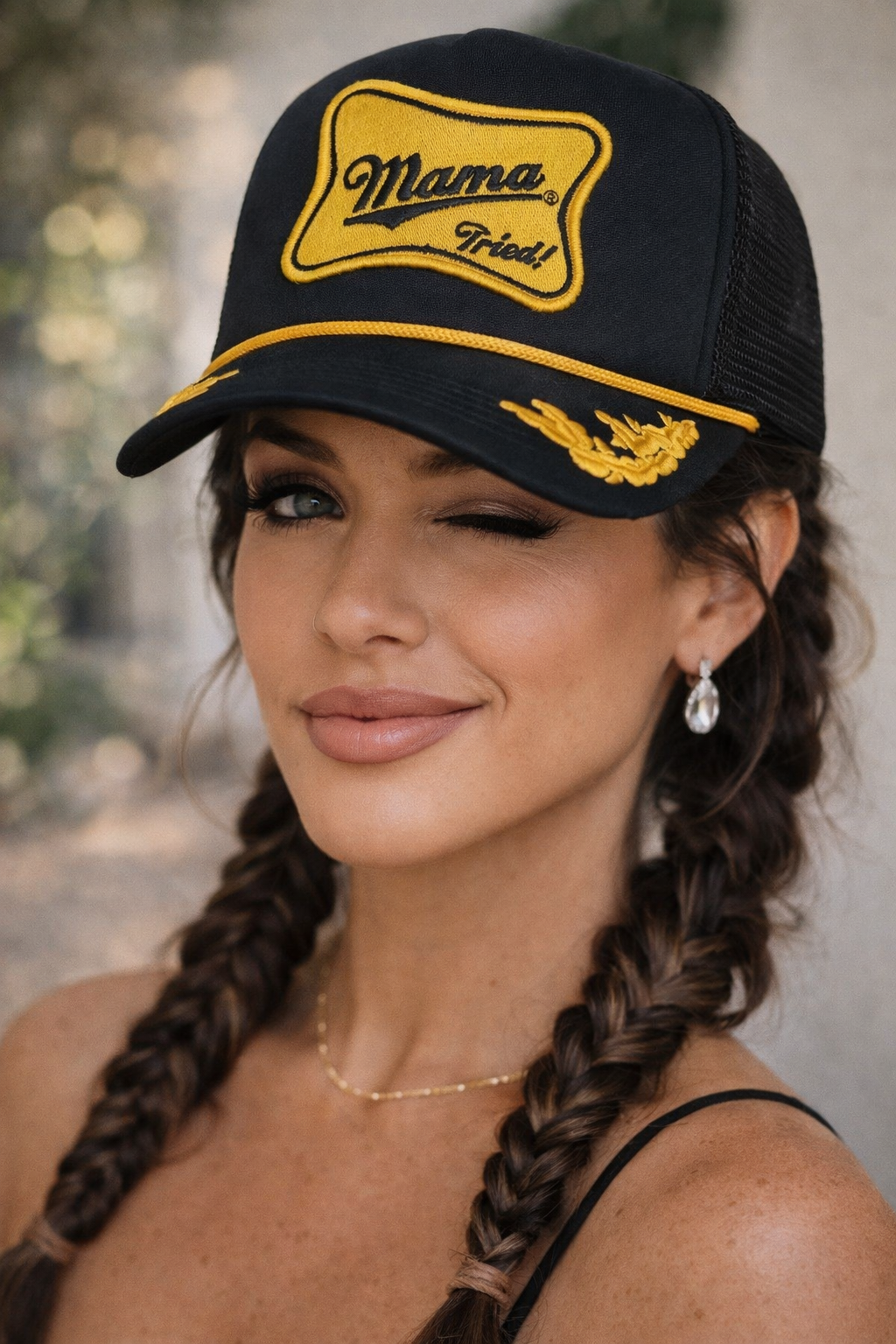 Mama Tried embroidered patch with merrowed edge. Available on your favorite foam trucker or Vibes Retro Rope hat! Foam truckers have a foam front with a mesh back and an adjustable snapback enclosure. Vibes retro rope hats are nylon caps with an adjustable snapback enclosure.