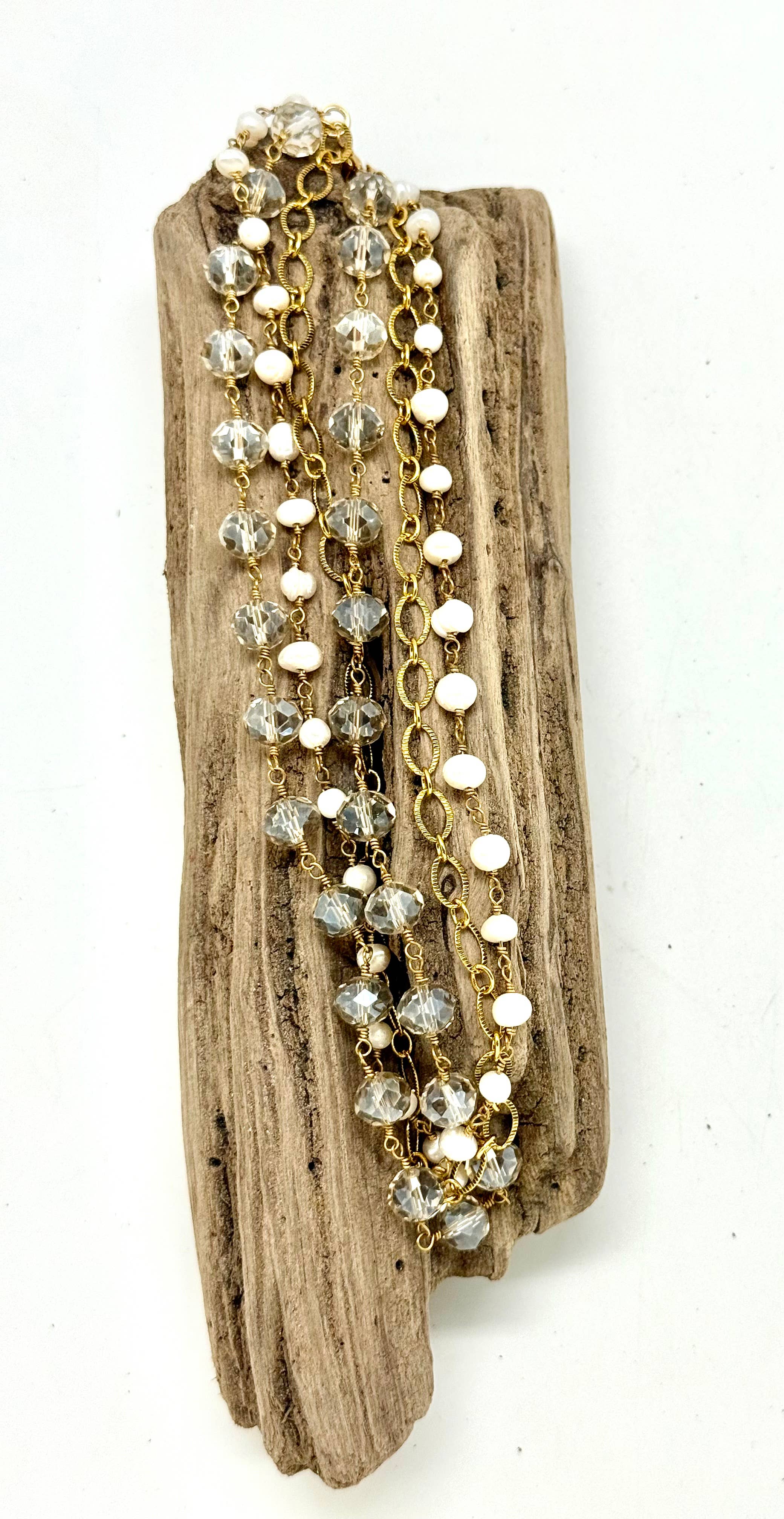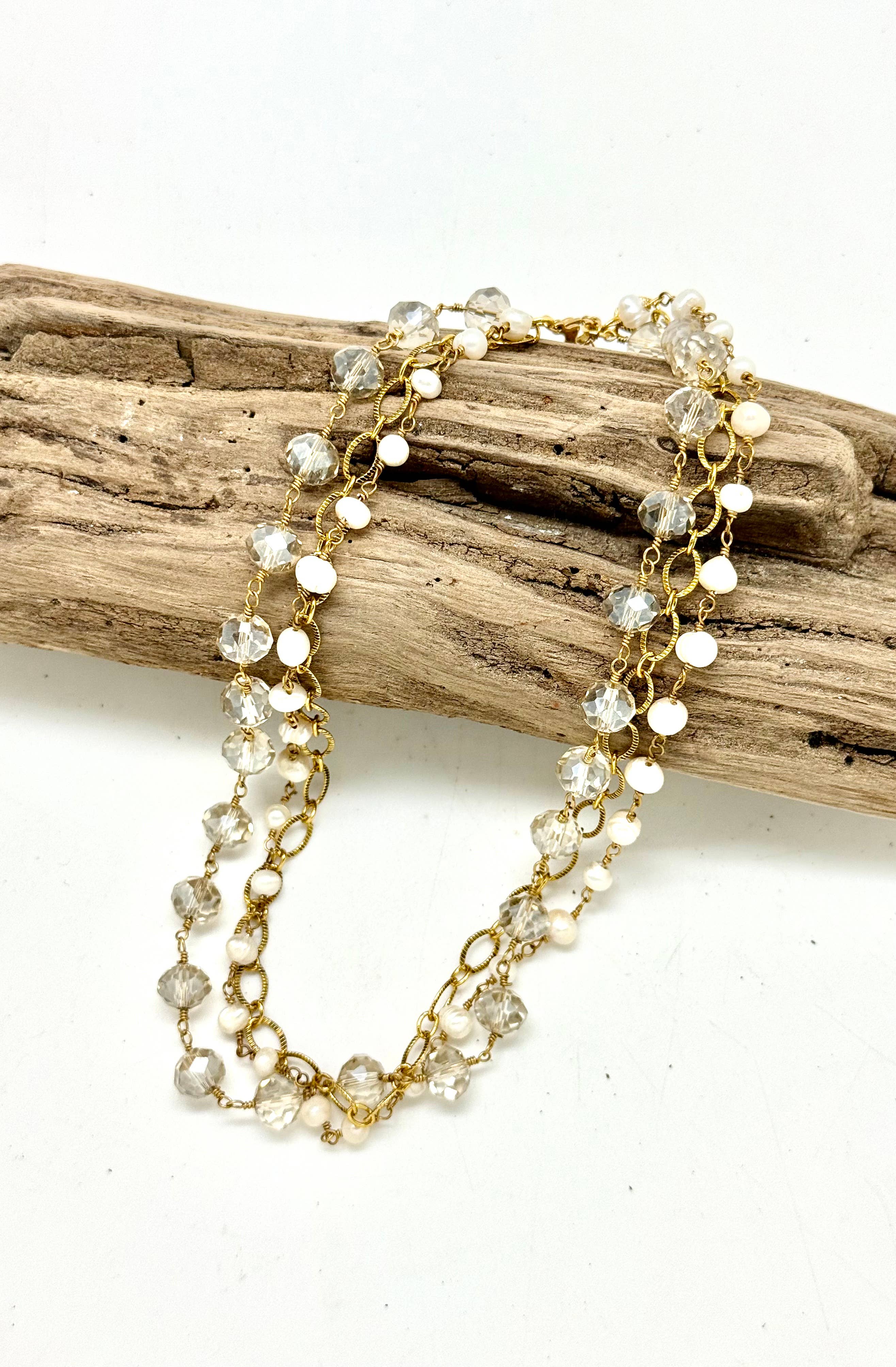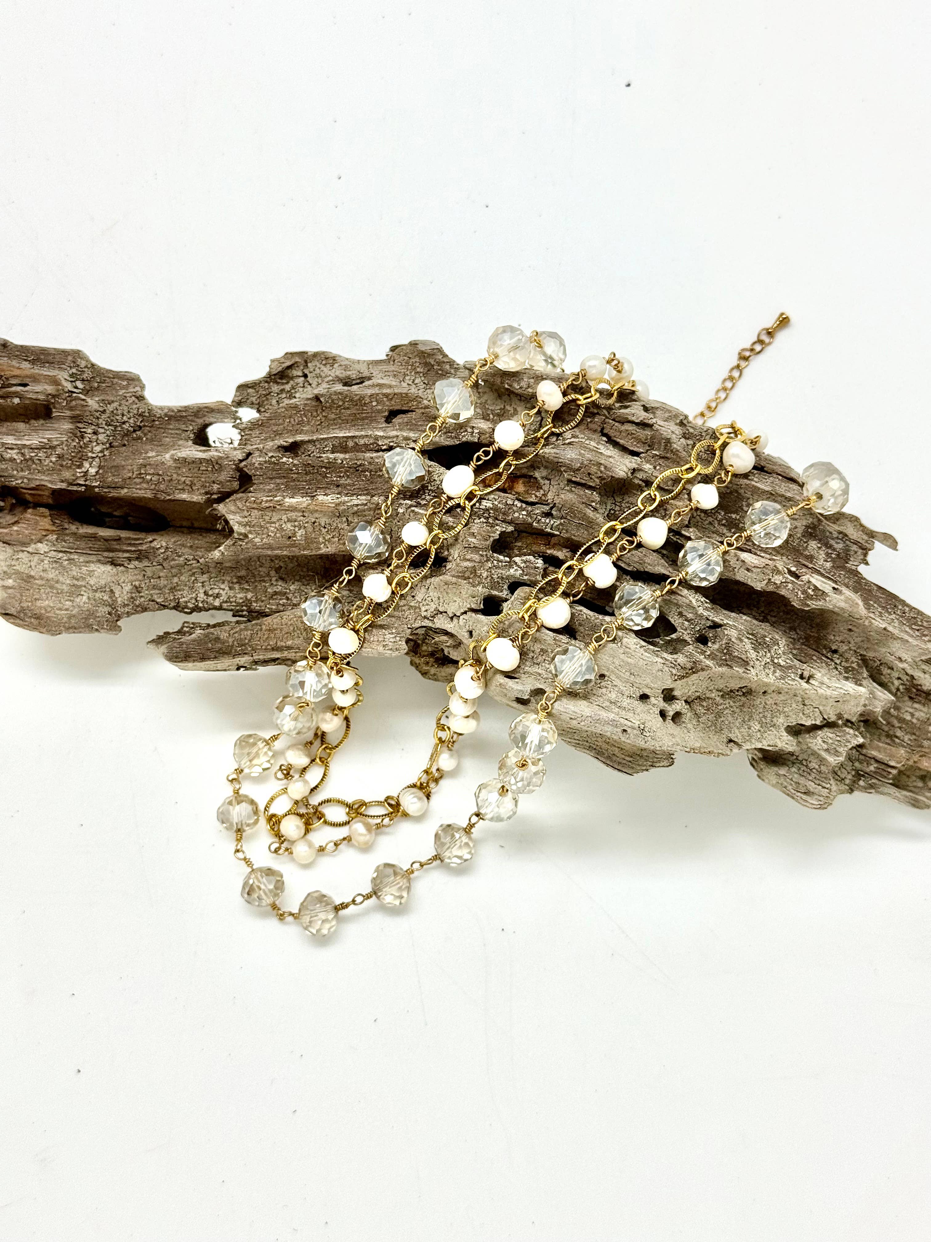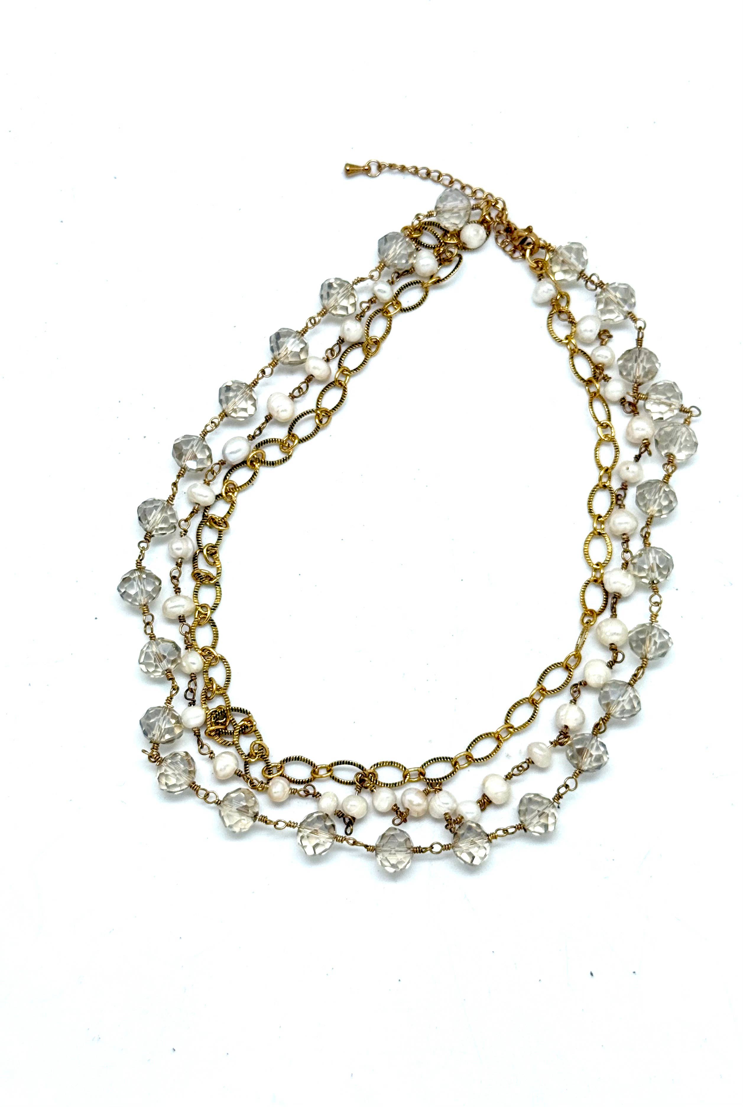Necklace Freshwater Pearl (6-8mm)Chain With Glass Bead(8mm) Brass Chain & Filigree Gold Brass Chain. 18” with 2” extension