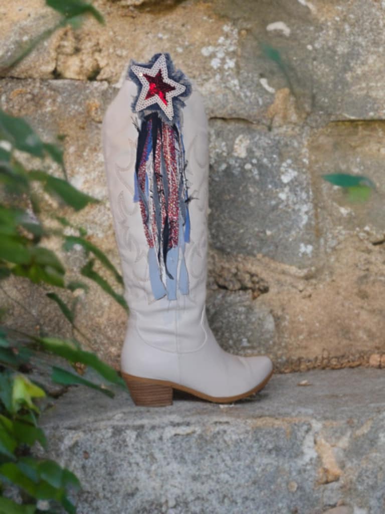 Celebrate your stars and stripes with Only in America — a set of 4 patriotic clip-ons that attach right to your boot pull loops. Each red glitter star is topped with flowing fringe in red, white, and blue for that bold, all-American vibe.