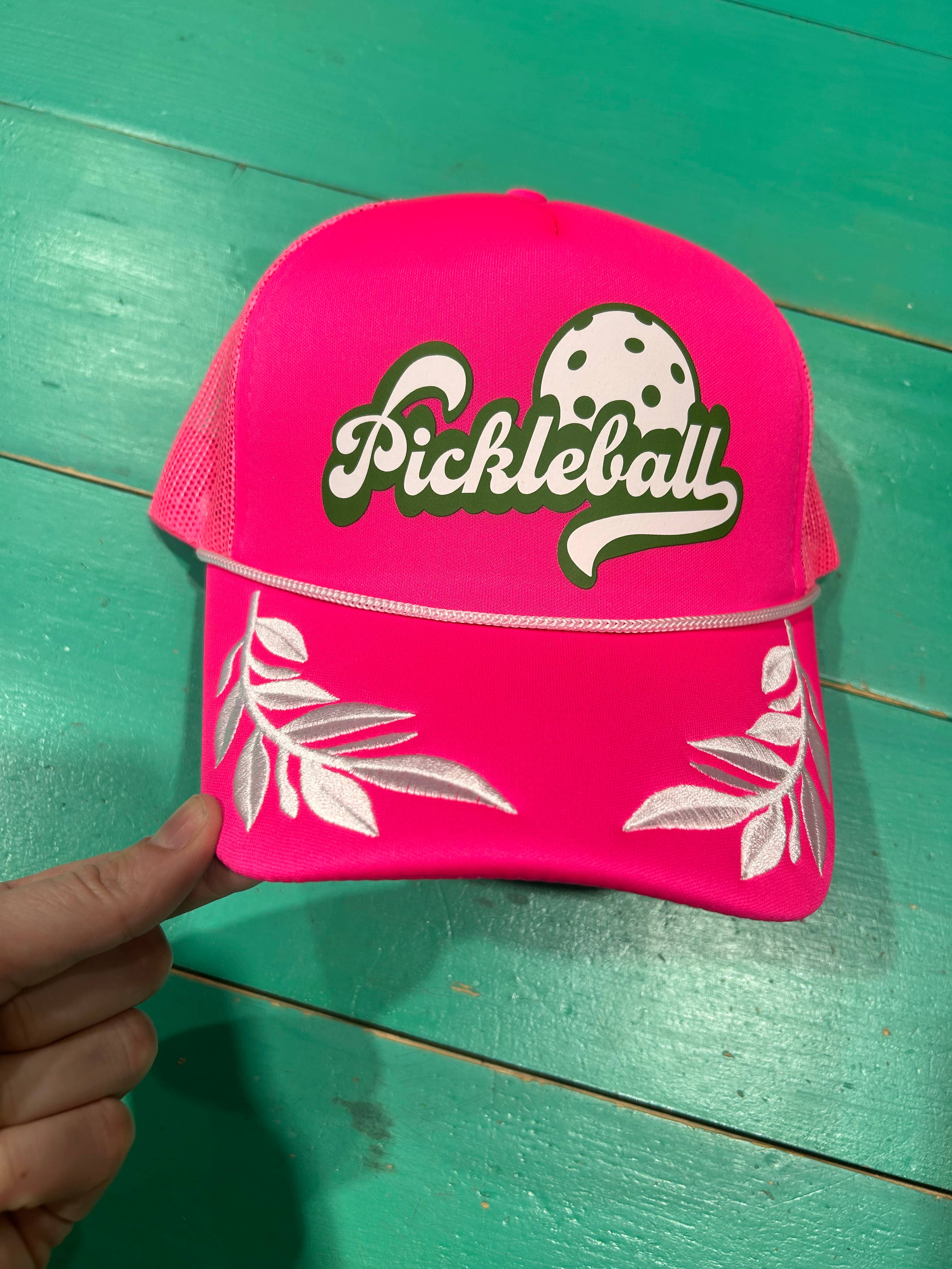Retro inspired Pickleball printed trucker hats! Captain hats have a foam front, mesh back, embroidered bill & rope accent, with adjustable snapback enclosure.