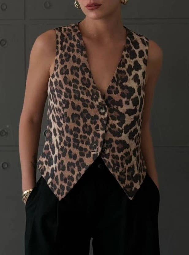 Stylish V-Neck Buttoned Leopard Print Vest Top